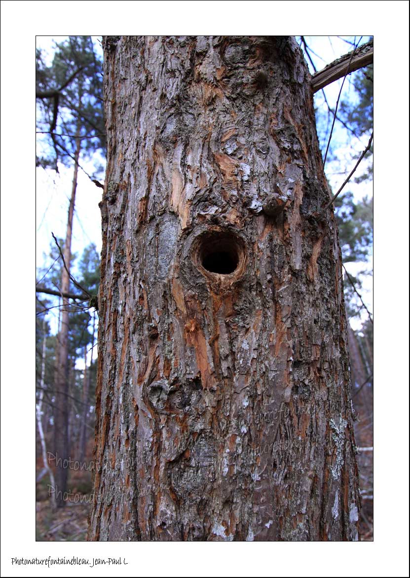 Voici un tronc comportant une cavité, appelée également loge, creusée par un Pic épeiche, impressionnant non ?